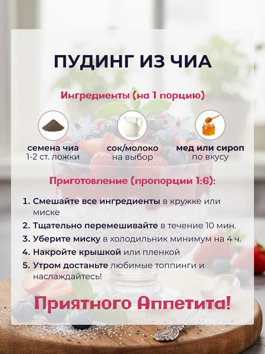 • Десерт с семенами чиа: добавьте семена в любое растительное молоко, кефир, ряженку или йогурт и оставьте на ночь. Утром вы получите нежный и вкусный десерт.