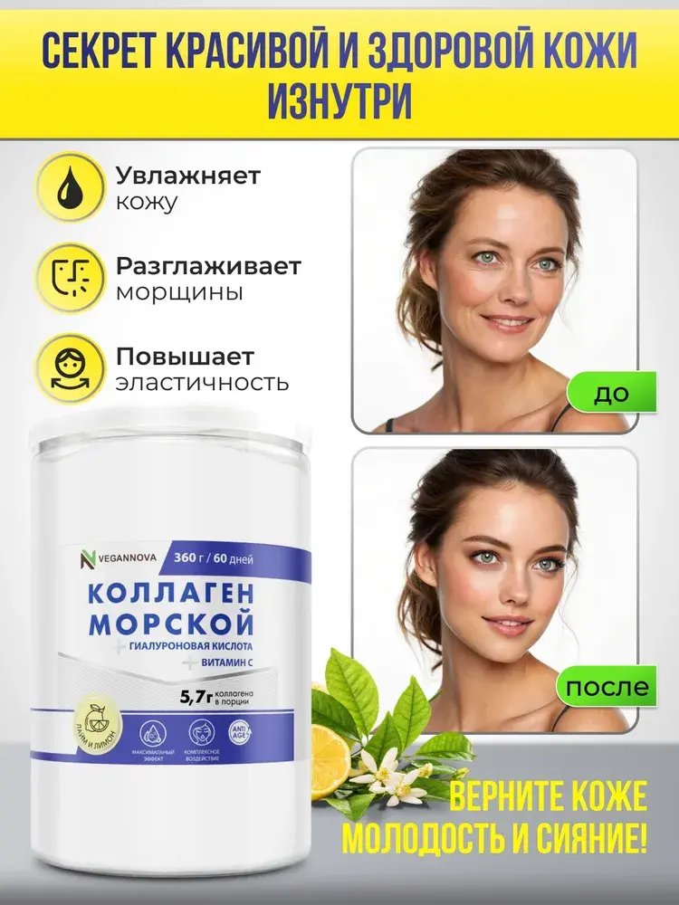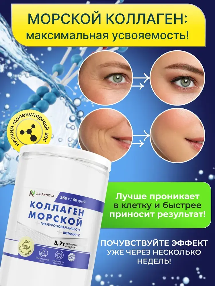 Морской коллаген с витамином С и гиалуроновой кислотой – это эффективная добавка, которая не только поддерживает здоровье и красоту кожи, но и оказывает благоприятное воздействие на опорно-двигательную систему.