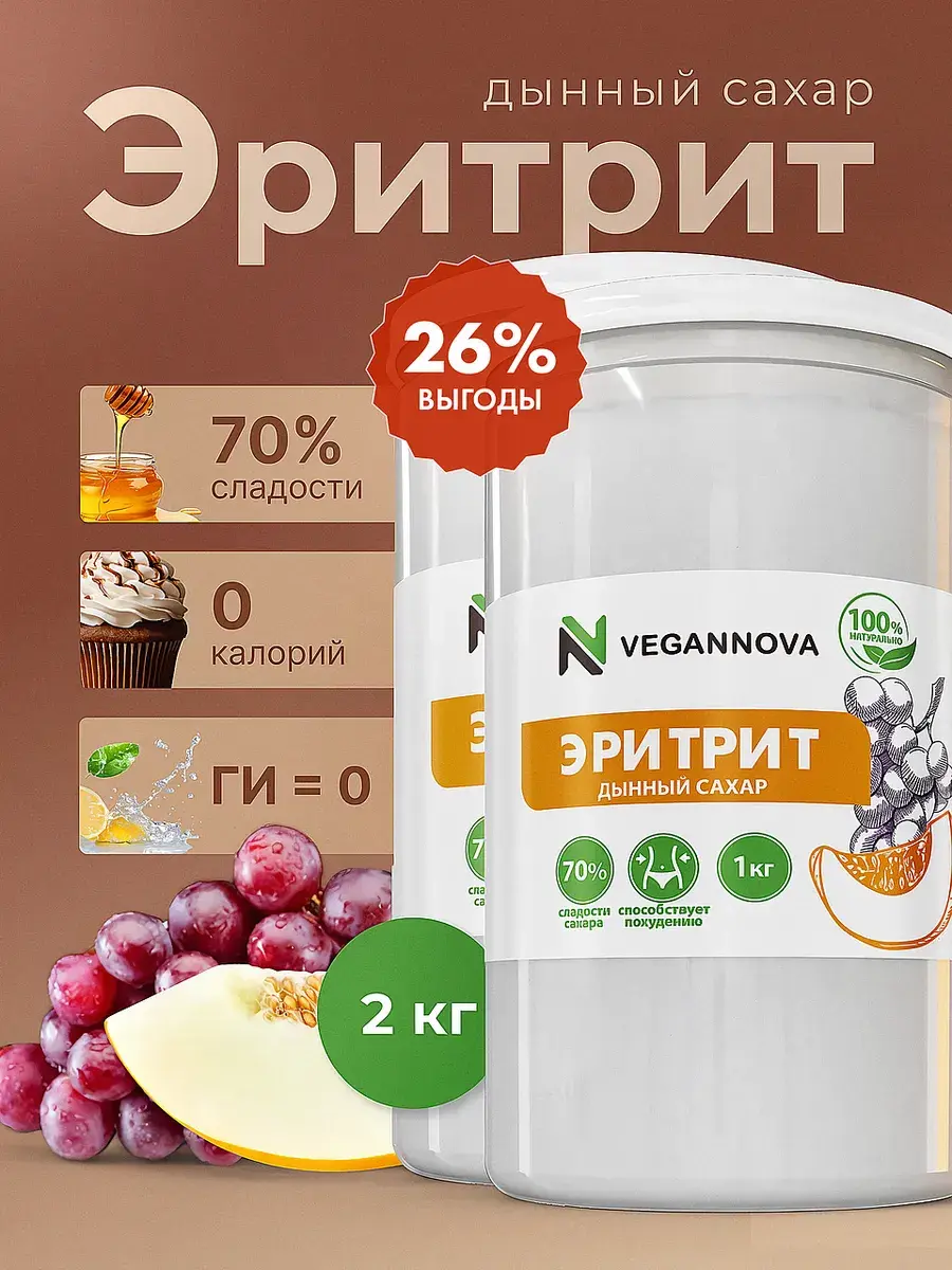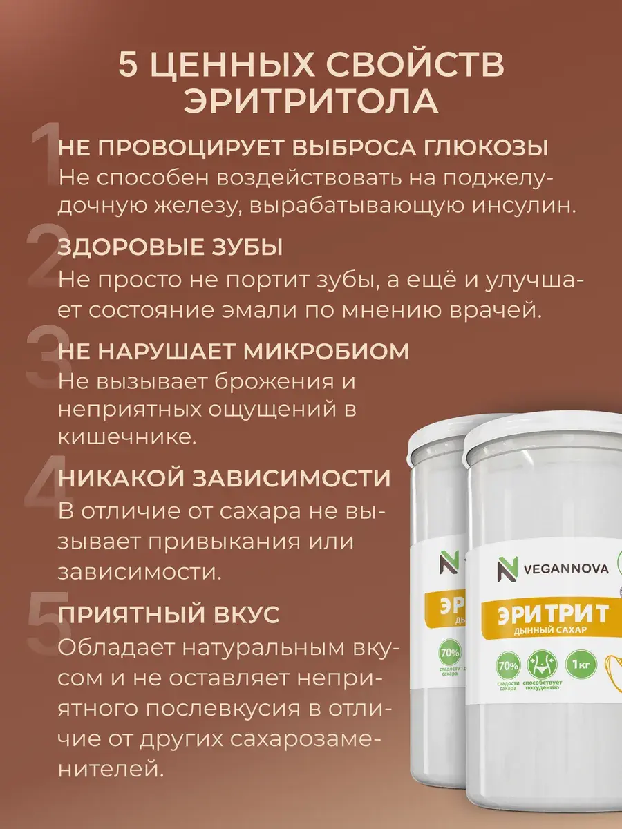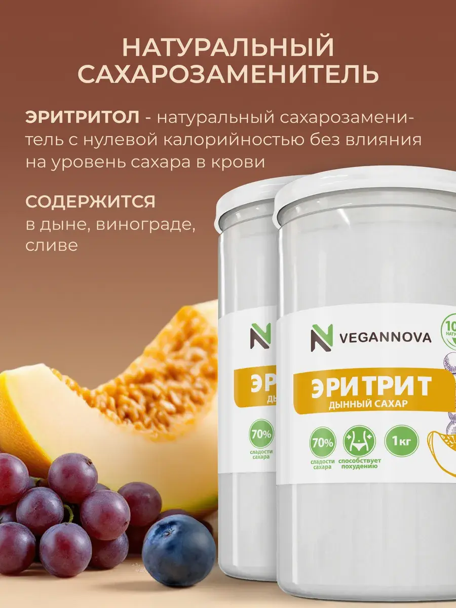 Натуральный сахарозаменитель из дыни, сливы, винограда, кукурузы. Его особенность в том, что это деликатная сладость: примерно 70% от уровня сладости сахара. Он не гипер-сладкий, как синтетические заменители, популярные сегодня. А ещё эритрит: