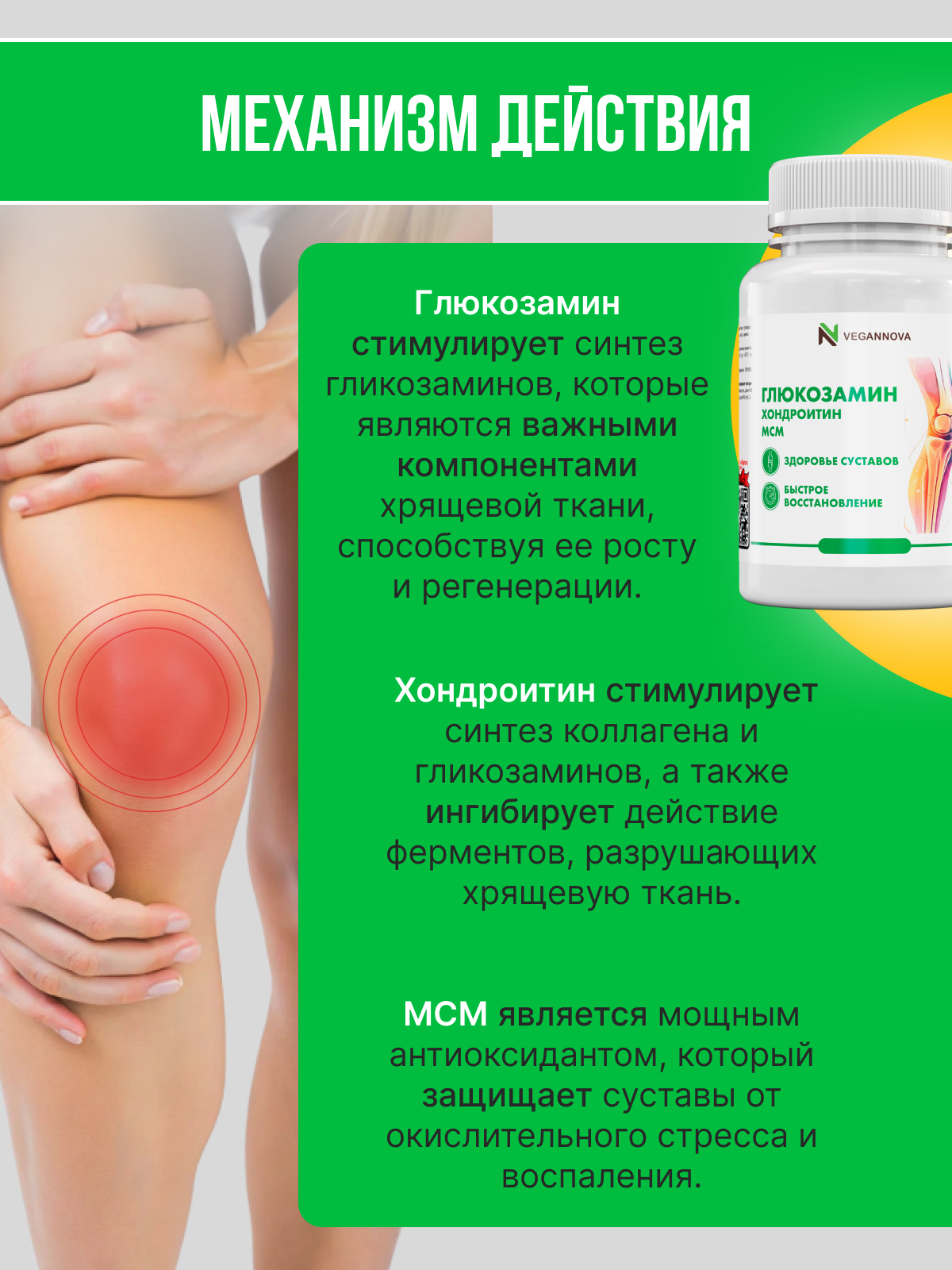 Глюкозамин является естественным компонентом хрящевой ткани и способствует ее восстановлению и поддержанию здоровья. Он помогает улучшить подвижность суставов, облегчить дискомфорт и снизить воспаление.