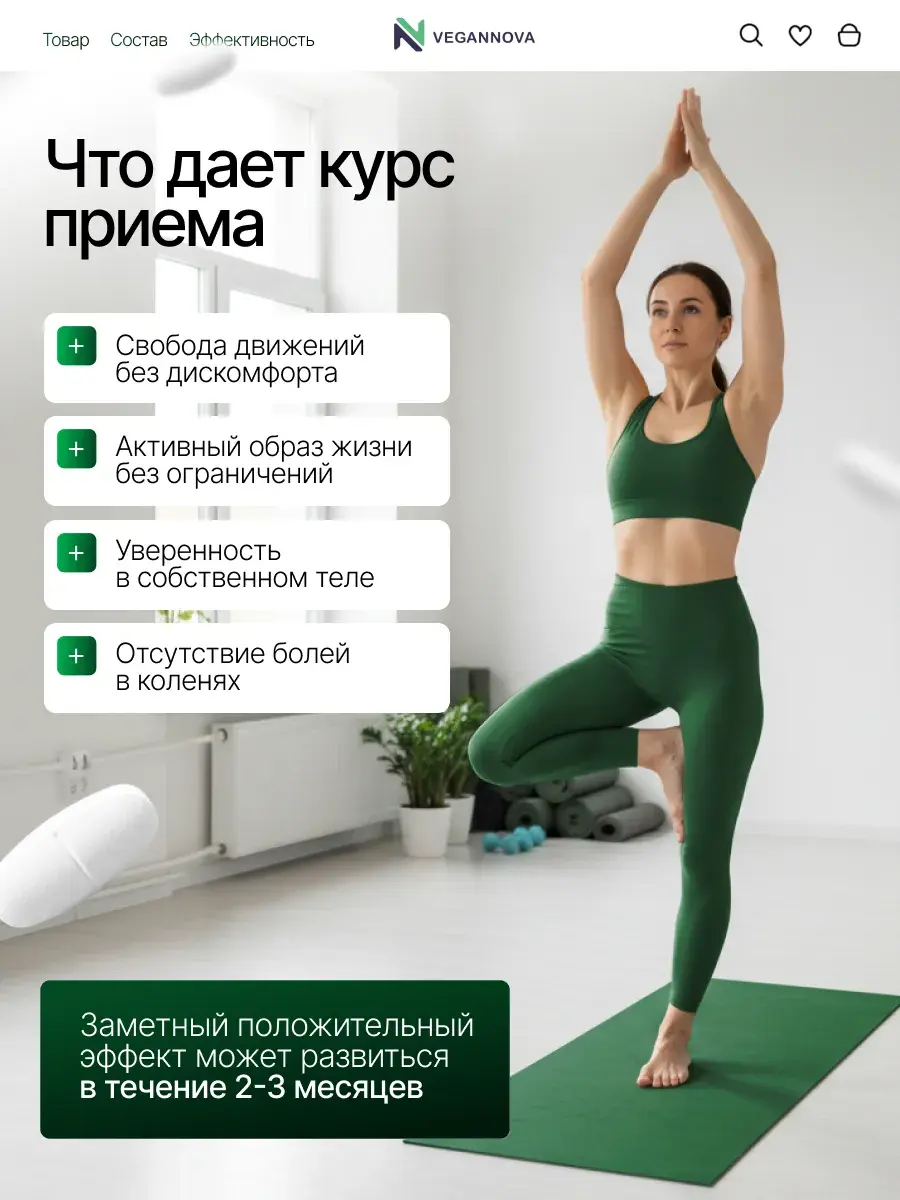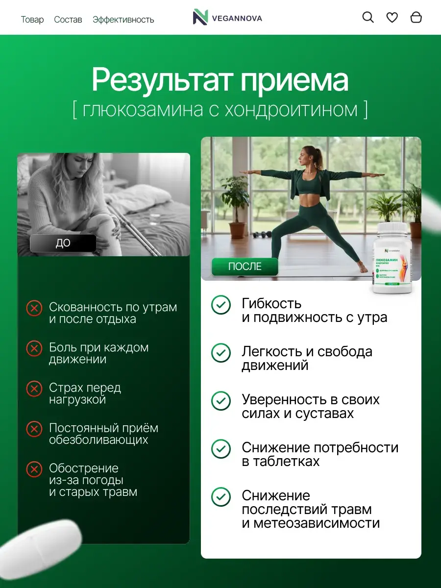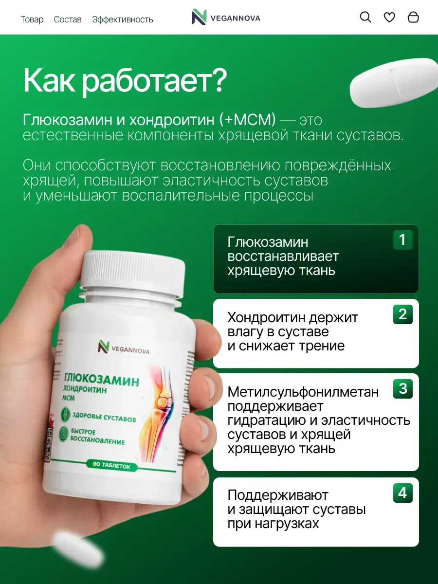 Откройте для себя мощную формулу для поддержания здоровья суставов и хрящей и комплексный подход к заботе о вашем организме. В составе продукта – глюкозамин, хондроитин и метилсульфонилметан (МСМ), которые вместе обеспечат оптимальную поддержку для активного образа жизни.