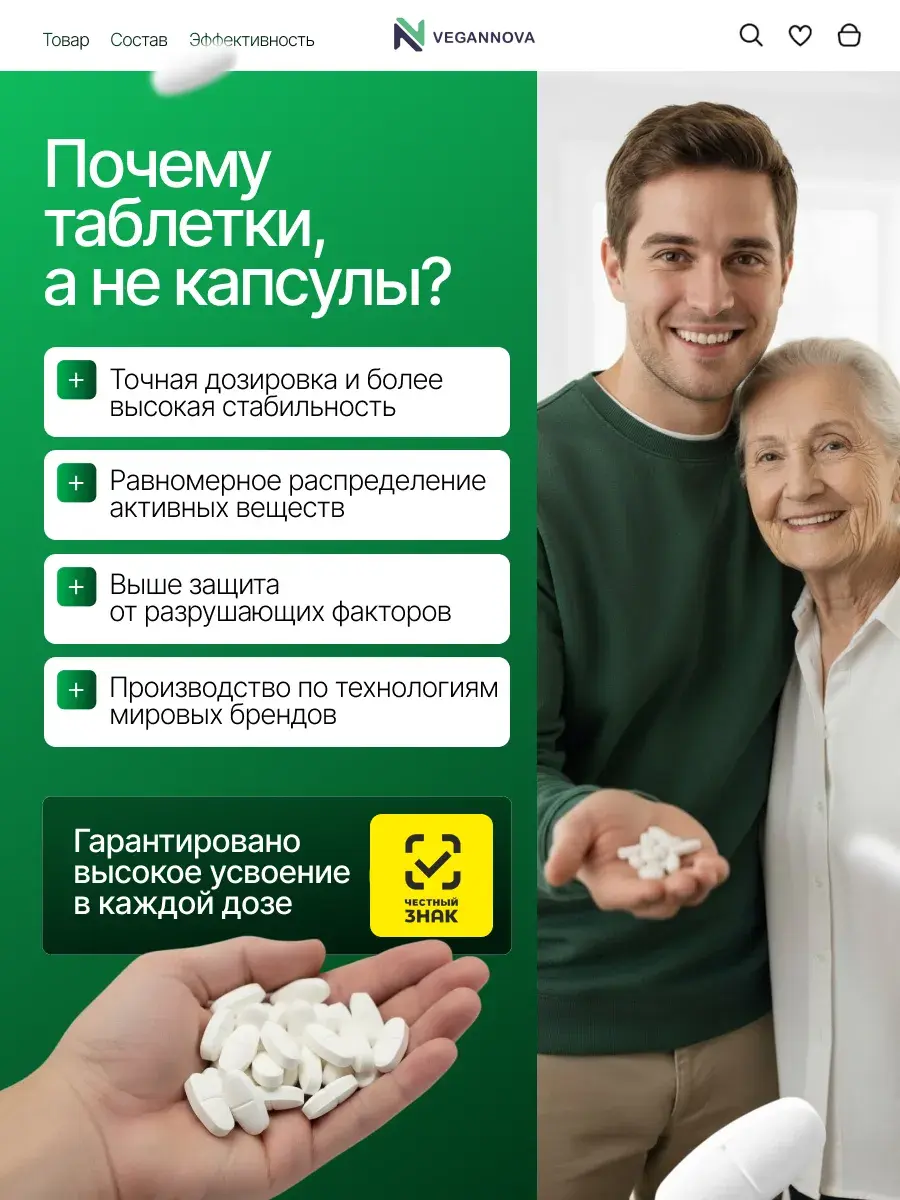 Удобная форма: таблетки легко принимаются и быстро усваиваются, что позволяет получить необходимую дозу полезных веществ в любое время.