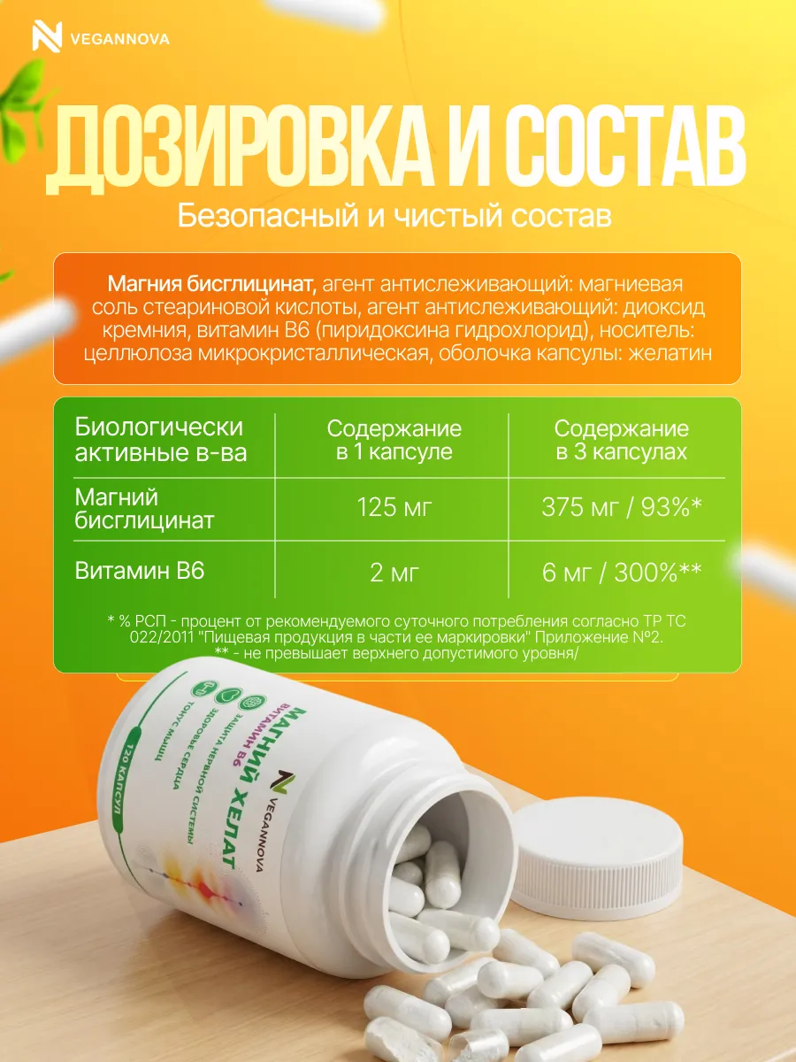 Кроме того, каждая капсула содержит добавку витамина B6, который усиливает действие магния и способствует его лучшему усвоению.