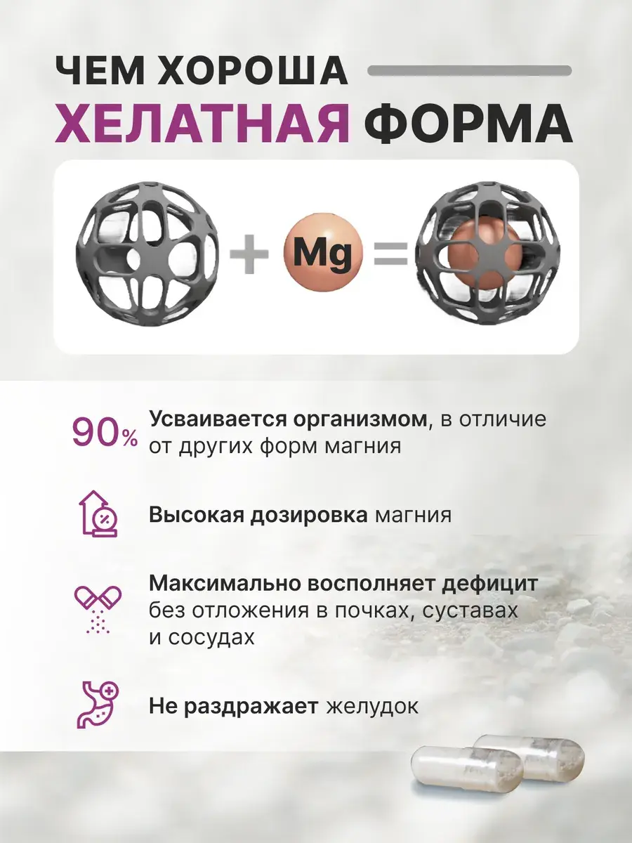 Однако, не все формы магния легко усваиваются нашим организмом. Именно поэтому мы предлагаем вам магний в хелатной форме – в ней он легко и полностью усваивается организмом, что гарантирует его максимальную эффективность.