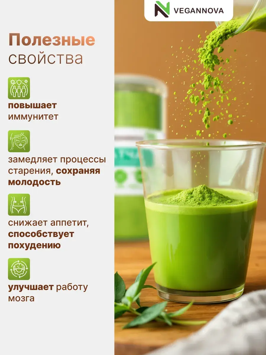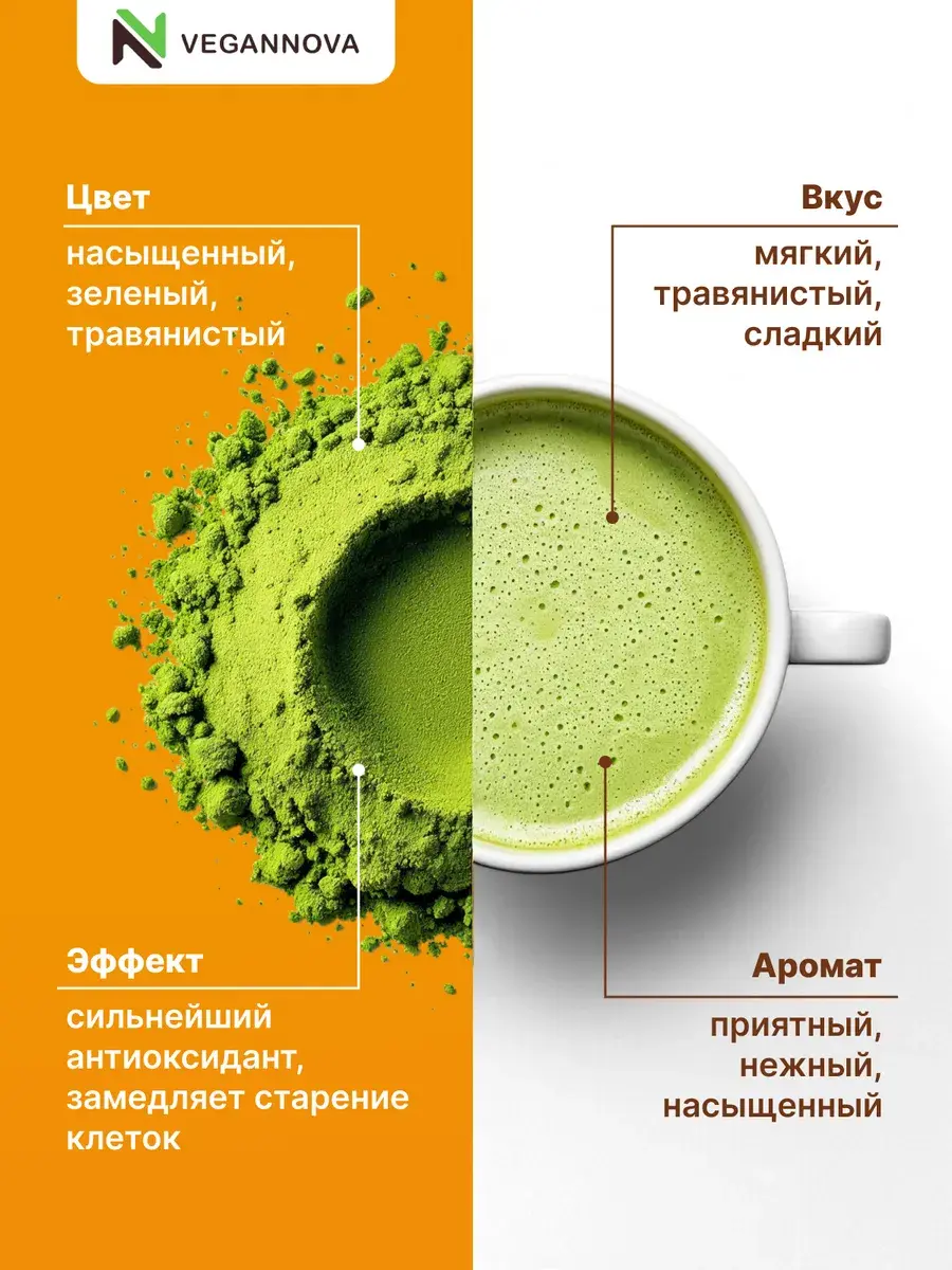 Матча VeganNova – именно премиальная, к тому же категории органик – это верхние листочки зелёного чая особого сорта. Он выращивается в полутеневых условиях, чтобы излишнее воздействие солнечных лучей тормозило образование хлорофилла в листьях чая, чуть замедлялся фотосинтез и образовывалось больше аминокислот в листьях, в том числе L-теанина, которого так много в хорошей матче. Эта аминокислота улучшает концентрацию внимания, память, даёт силы, энергию, выносливость. Так как матча используется в порошковой форме, вы получите максимум полезных веществ из заваренного чая.