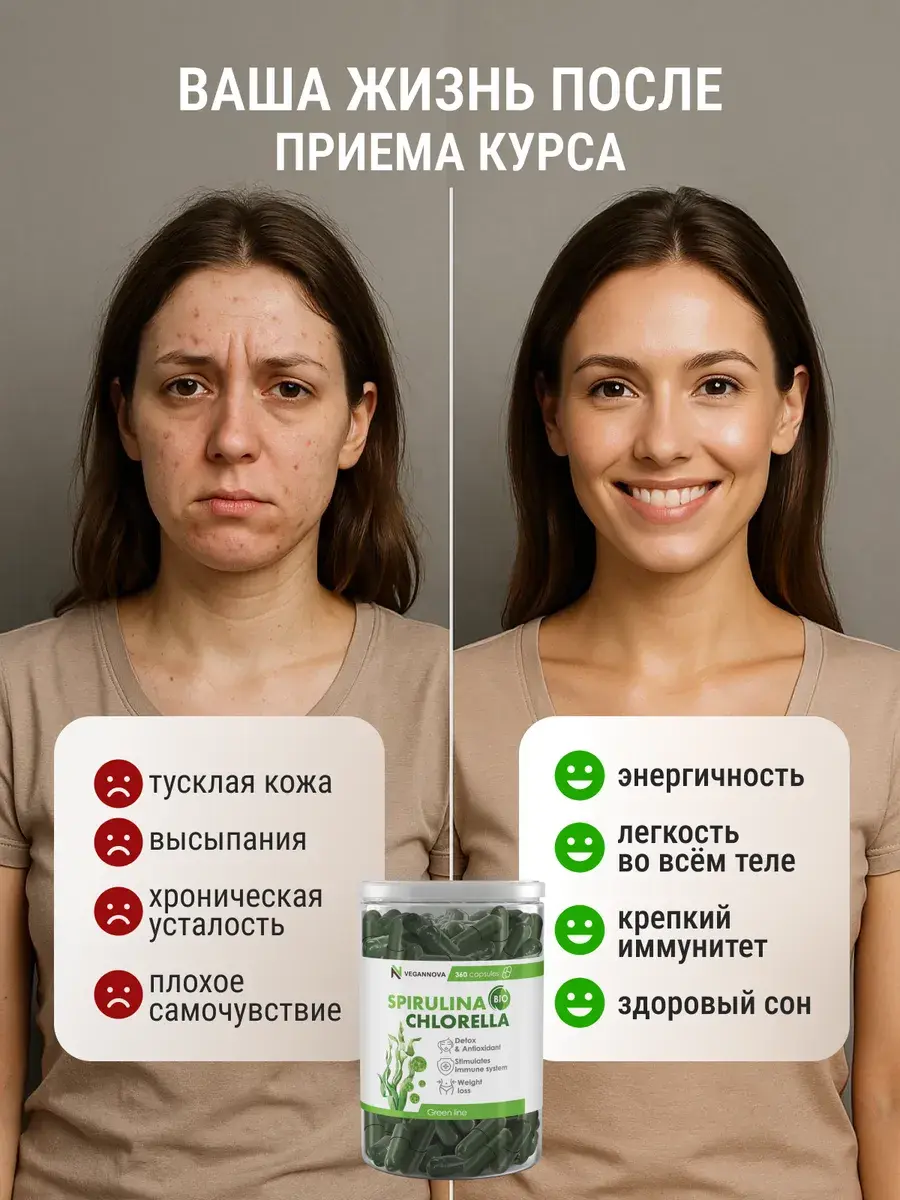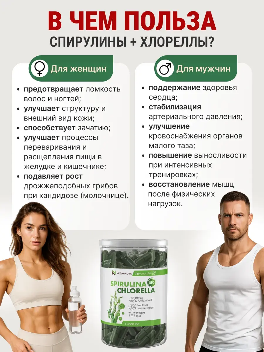 Состав: порошок спирулины натуральной, порошок хлореллы натуральной, капсула (говяжий желатин, вода).