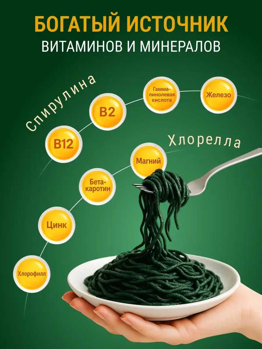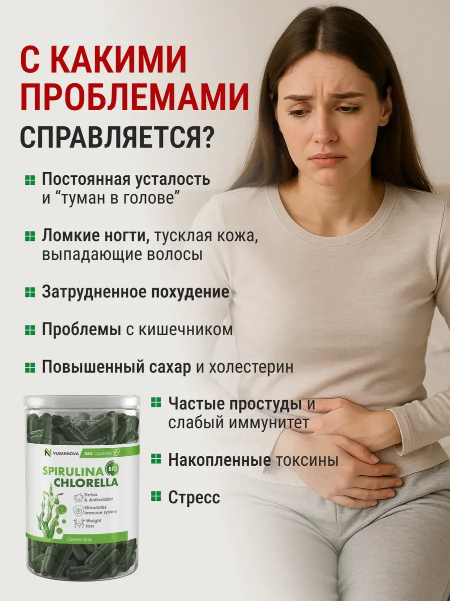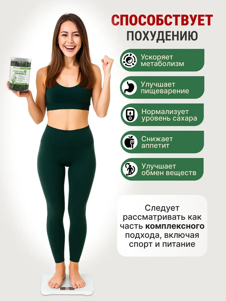 Состав: порошок спирулины натуральной, порошок хлореллы натуральной, капсула (говяжий желатин, вода).