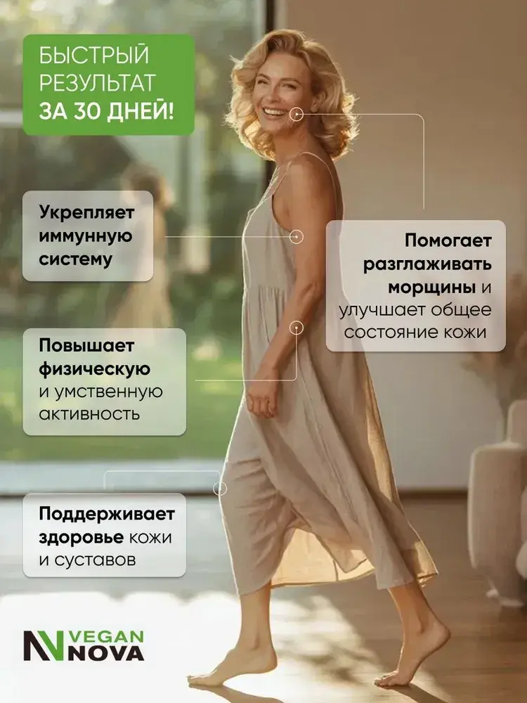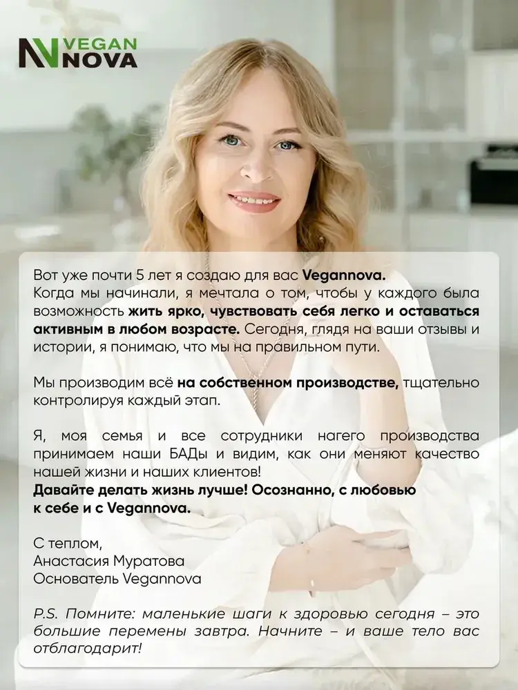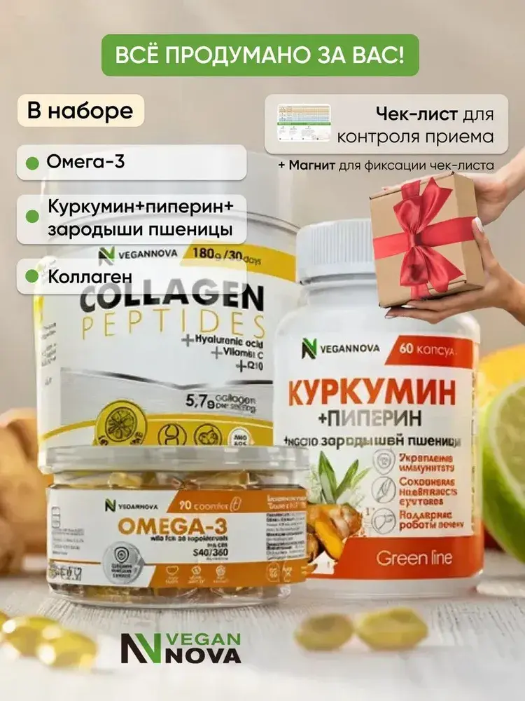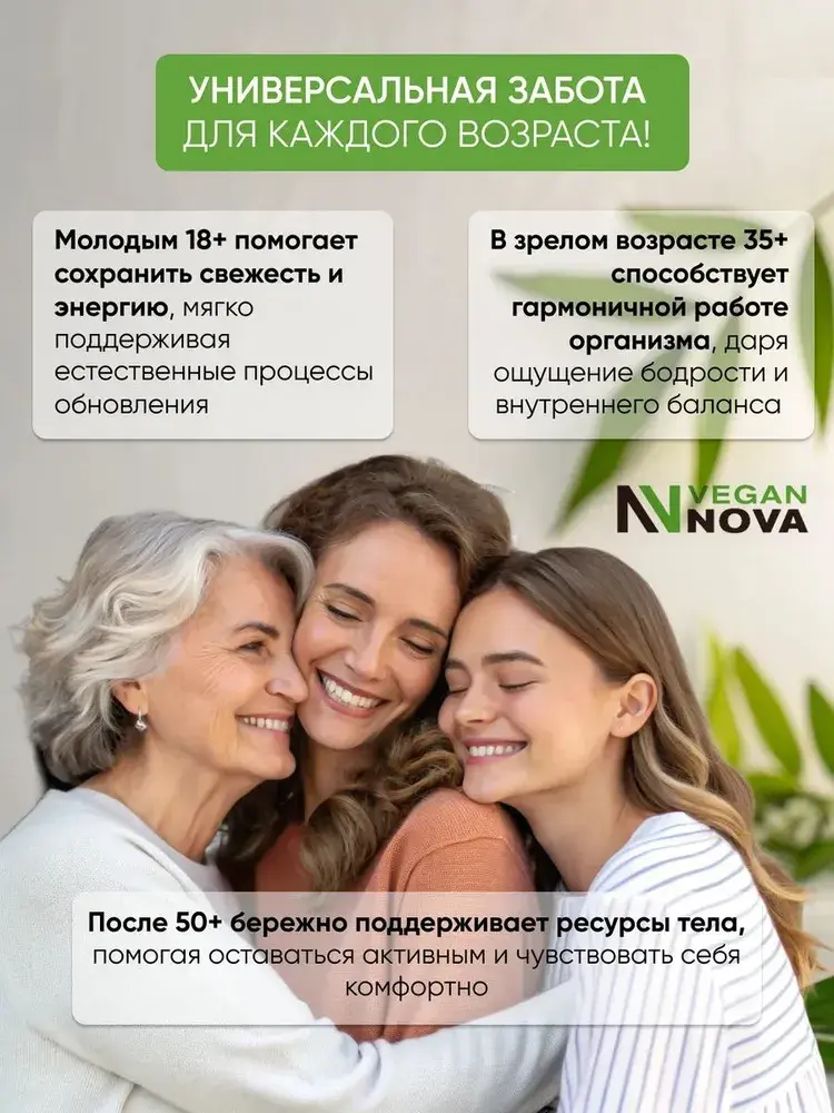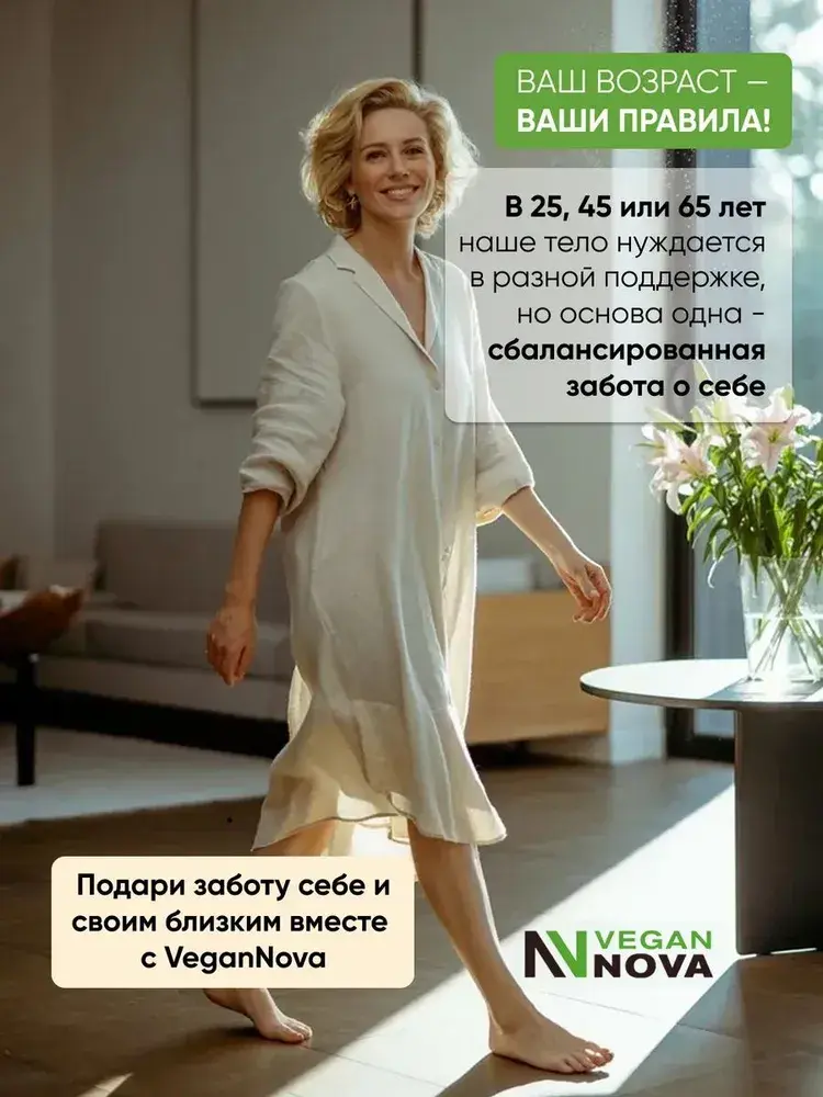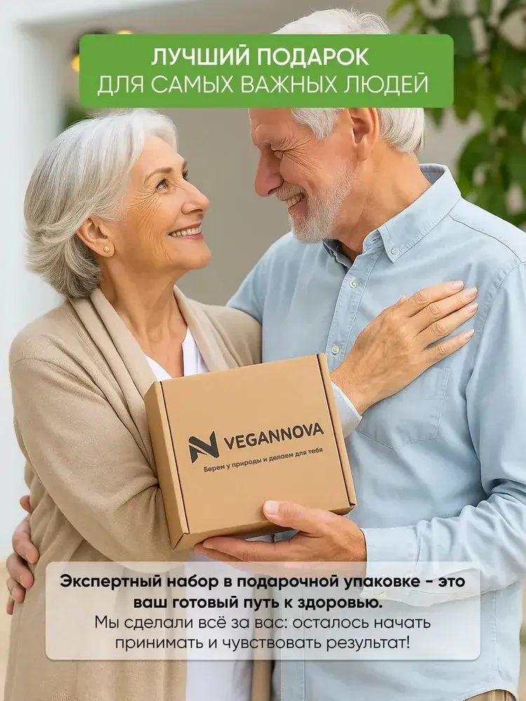 Естественные процессы старения затрагивают кожу, суставы, сердечно-сосудистую и иммунную системы. Набор «Активное долголетие» от бренда VeganNova улучшит общие показатели здоровья организма и снизит риск хронических заболеваний. Расскажем о каждом компоненте набора подробнее: