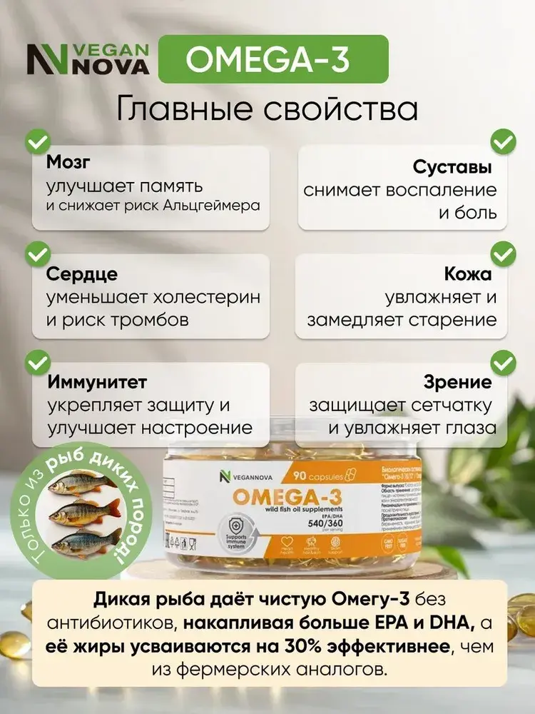 • Поддержка когнитивных функций. Омега-3 – важный компонент клеточных мембран мозга, способствует улучшению памяти и внимания. Регулярное потребление может замедлить возрастное снижение когнитивных способностей и снизить риск развития нейродегенеративных заболеваний