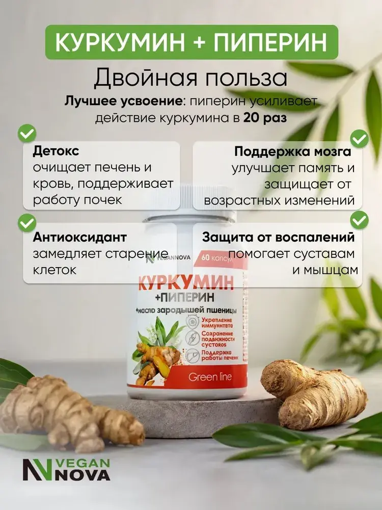Куркумин – активное вещество, содержащееся в корне куркумы, известное своими мощными антиоксидантными и противовоспалительными свойствами. Пиперин – экстракт чёрного перца, значительно увеличивает биодоступность куркумина. Витамин E и другие антиоксиданты, содержащиеся в масле ростков пшеницы, способствуют укреплению иммунной системы, повышая её способность защищать организм от инфекций и болезней, а полезные жирные кислоты, содержащиеся в масле, поддерживают здоровье сердечно-сосудистой системы.