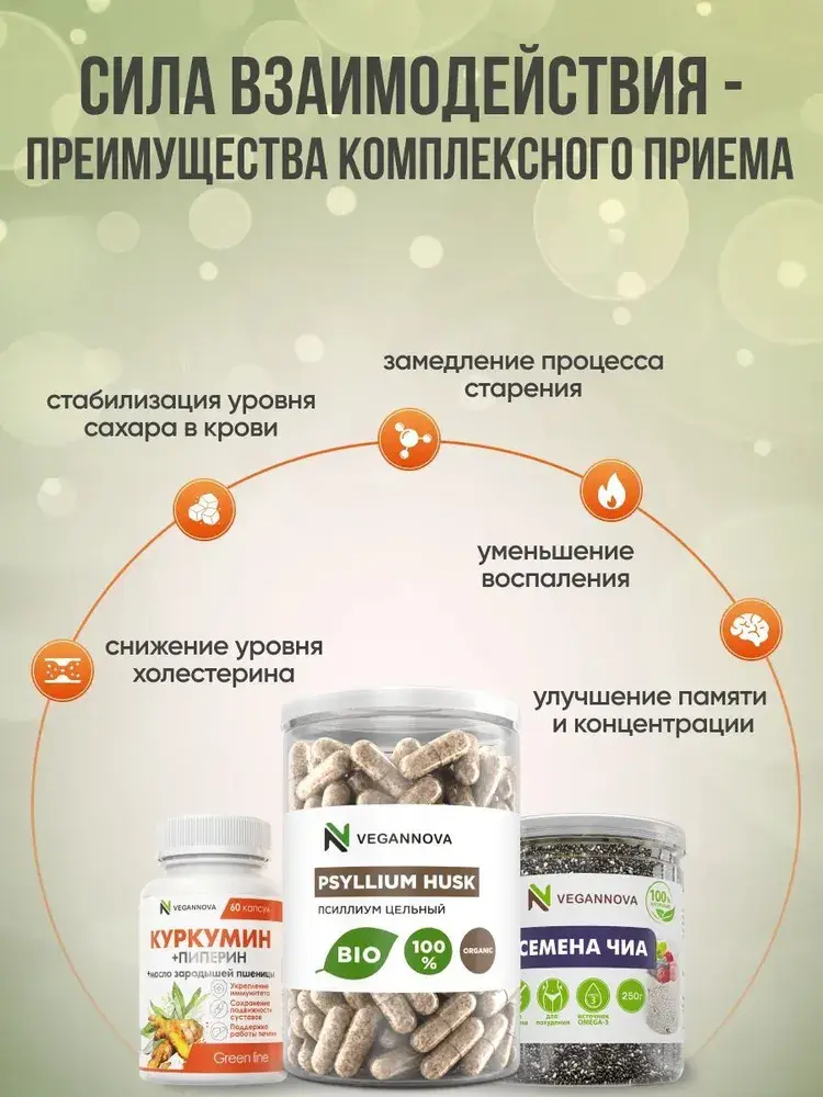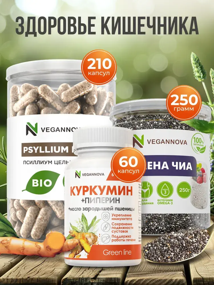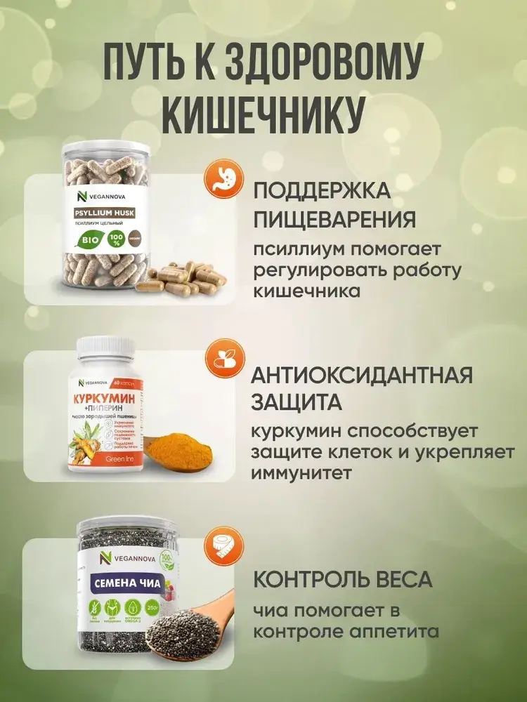Набор «Здоровье кишечника» от бренда VeganNova улучшает пищеварение, поддерживает баланс микробиома, помогает контролировать уровень сахара и холестерина, способствует снижению веса. Расскажем о каждом компоненте набора подробнее: