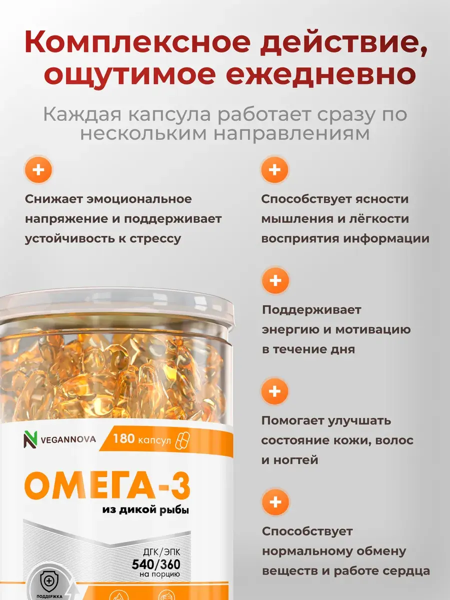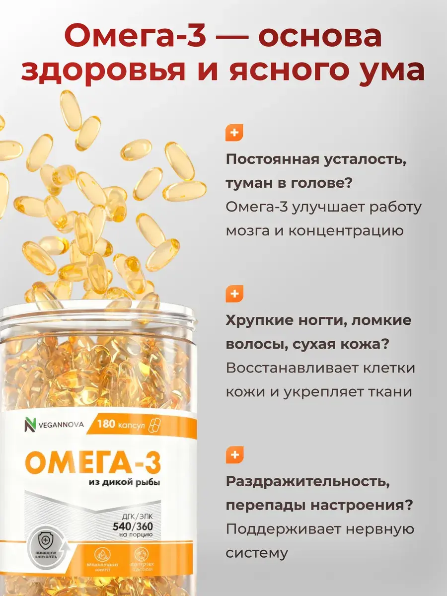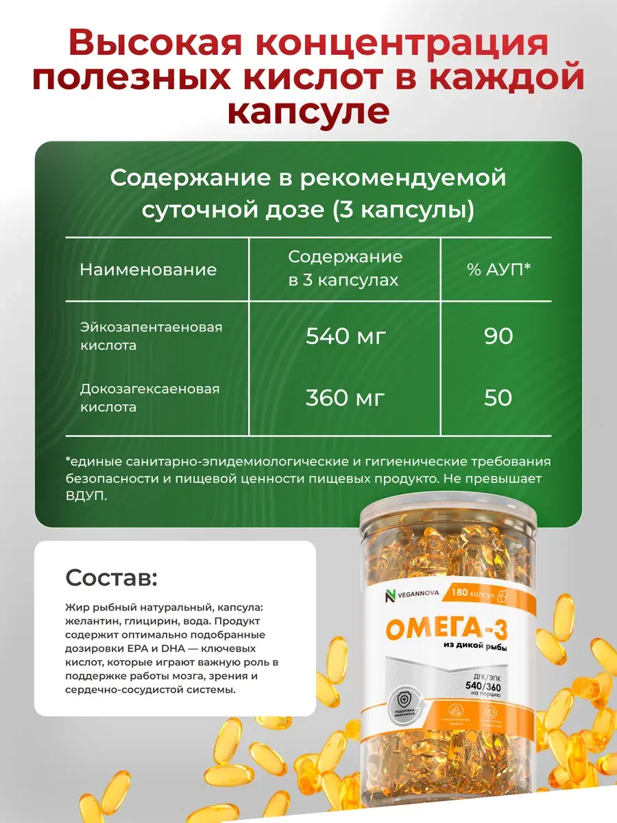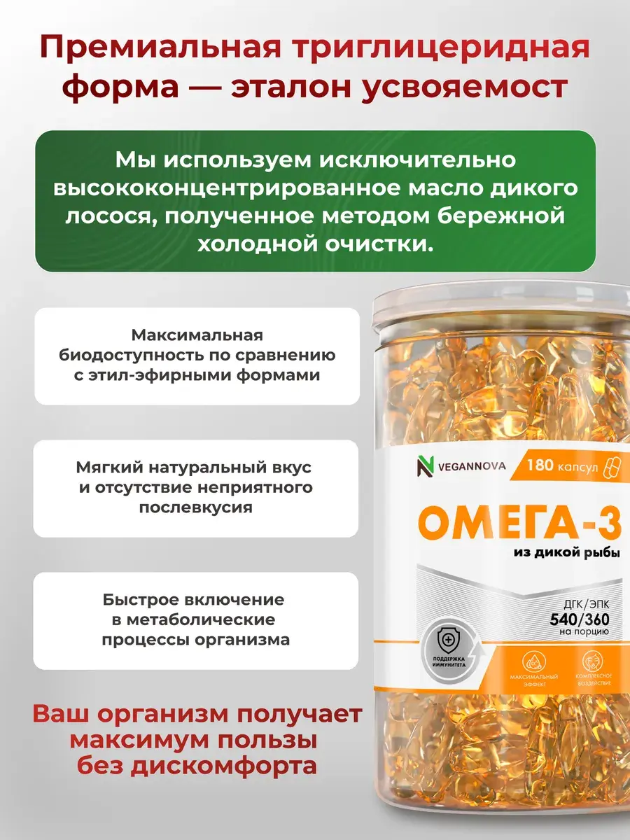 Это РЫБНЫЙ жир – жир из тушки рыбы, и, что важно: дикой рыбы. Сырьём для нашей омеги является лосось дикий. Никаких искусственных ферм с препаратами для быстрого размножения и роста рыбы. Только чистейшая дикая рыба, плюс современные методы дополнительной очистки рыбного жира.