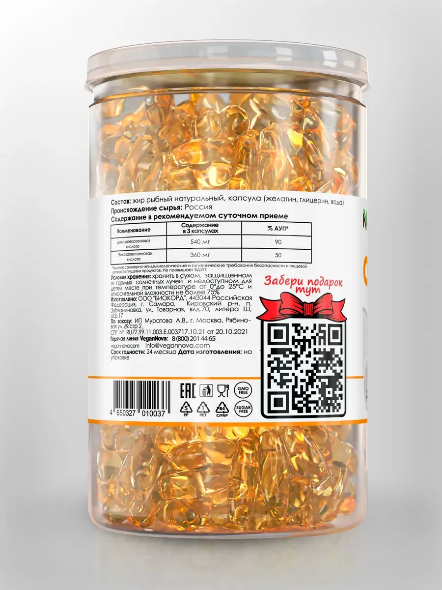 Состав: жир рыбный натуральный, капсула (желатин говяжий, глицерин, вода).