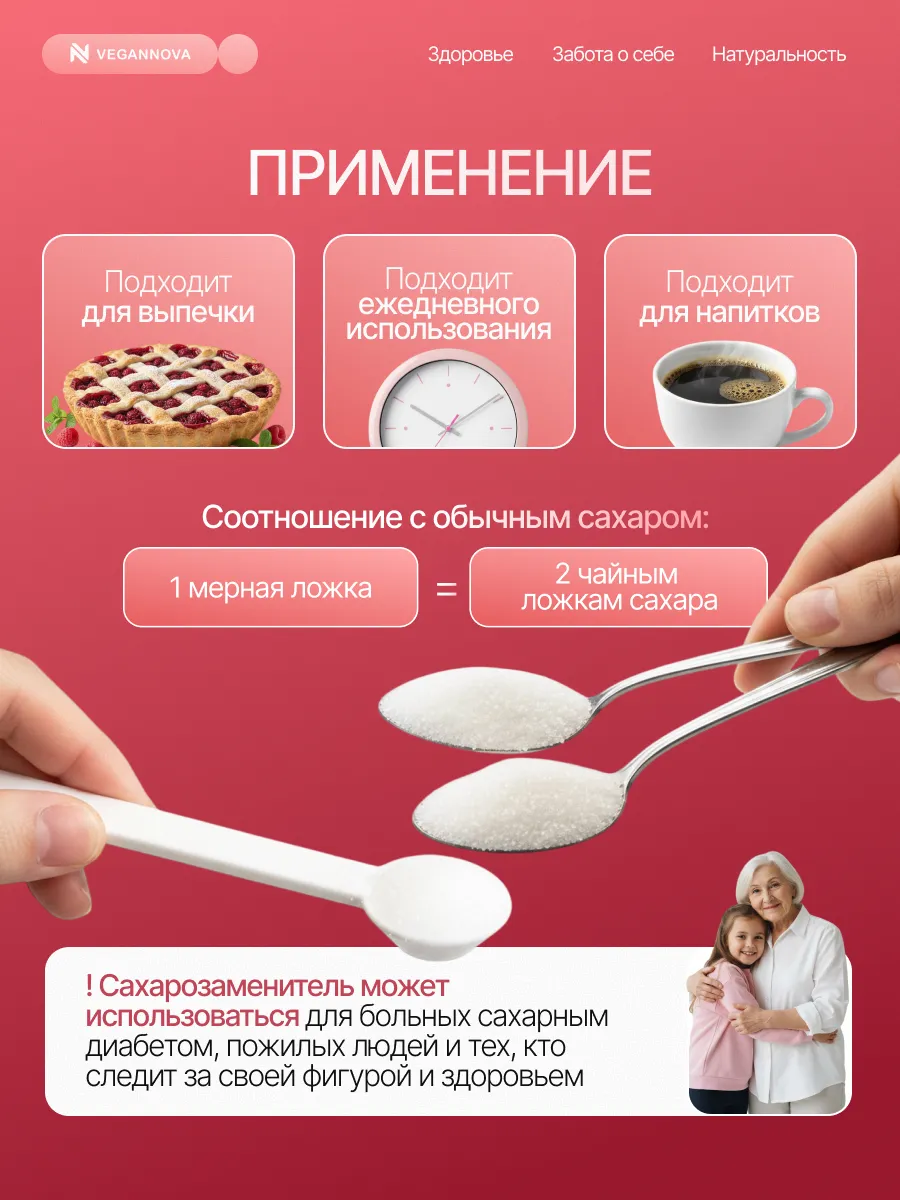 Идеально повторяет вкус и текстуру сахара, без привкуса и послевкусия. Не вызывает проблем с пищеварением. Пью с ним кофе, добавляю в выпечку - ведет себя точно как сахар. Спасение для сладкоежек на ПП!