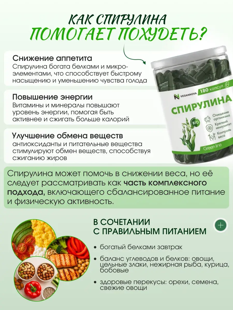 Спирулина – это настоящий суперфуд, богатый белками, железом, бета-каротином, витамином B12, кальцием и многими другими полезными веществами. Она помогает поддерживать здоровье иммунной системы, энергетический метаболизм и укрепляет общую жизненную силу организма.