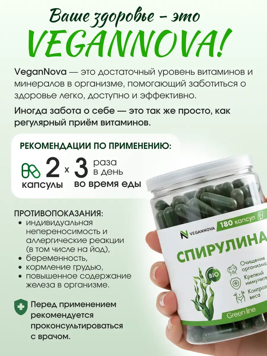 Спирулина также известна своими антиоксидантными свойствами, которые помогают защитить клетки от повреждений свободными радикалами. Спирулина от бренда VeganNova – 100% натуральная водоросль, растущая в высокогорном озере Азии. Продукт полностью натуральный, не содержащий никаких добавок.