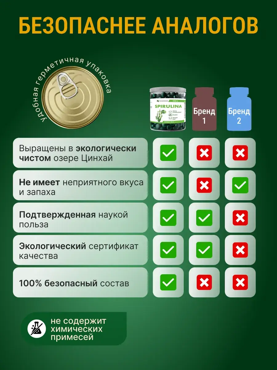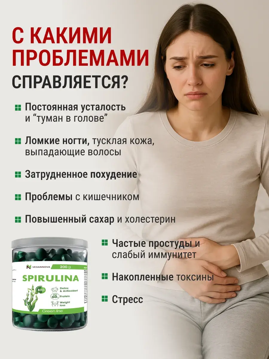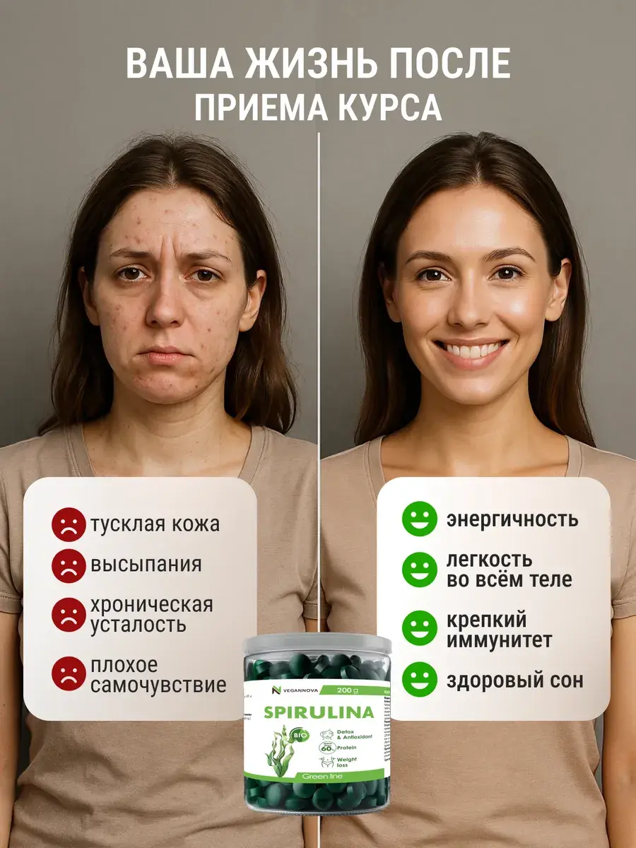 Спирулина – это настоящий суперфуд, богатый белками, железом, бета-каротином, витамином B12, кальцием и многими другими полезными веществами. Она помогает поддерживать здоровье иммунной системы, энергетический метаболизм и укрепляет общую жизненную силу организма.