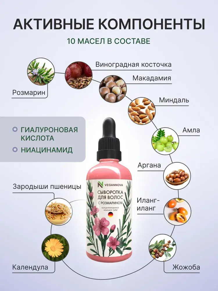 Это чудо-средство для волос на основе немецкого розмарина, в первую очередь способствует укреплению волосяных луковиц и более интенсивному росту волос.